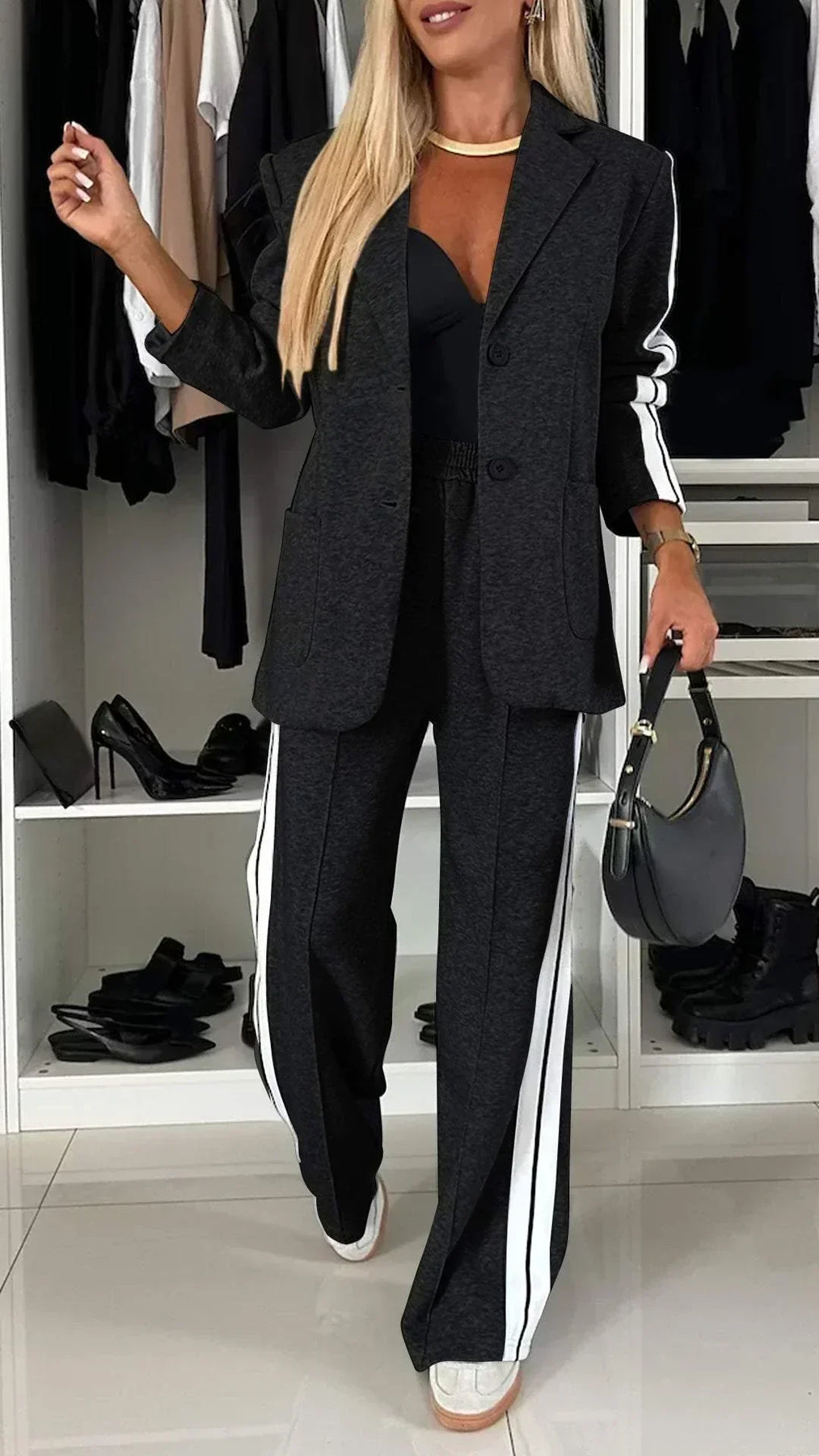 • Sporty-Chic Details: White side stripes on the blazer and pants add a contemporary, eye-catching touch.